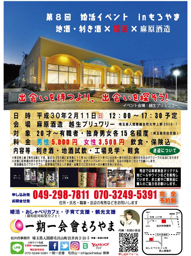 平成30年2月11日(日)に開催される第8回婚活イベントの会場が越生ブリュワリーに決定しました!!