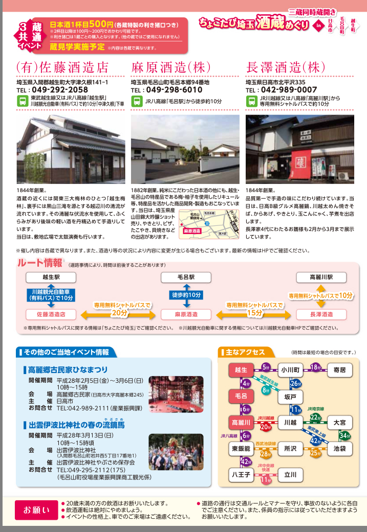 3月6日(日)三蔵同時蔵開き『ちょこたび埼玉酒蔵めぐり』が開催されます!麻原酒造でも美味しいお酒と美味しい食べ物をご用意!皆様のお越しを心よりお待ちしております。