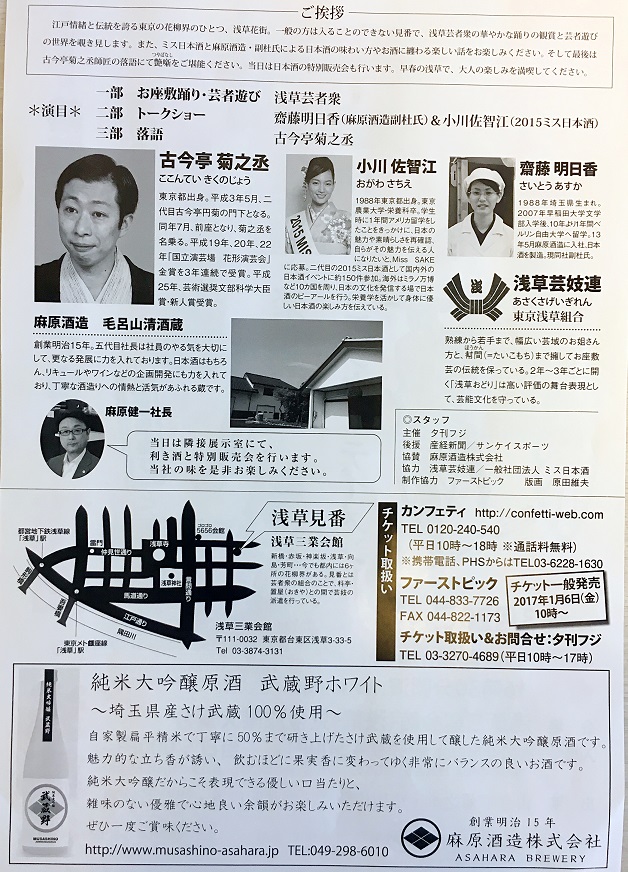 当日は古今亭菊之丞師匠の落語は勿論のこと芸者遊びや2015ミス日本酒の小川佐智江さんと弊社スタッフのトークショーが行われます。利き酒や特別販売会も行いますのでこの機会に是非、落語と弊社日本酒をご堪能下さい!